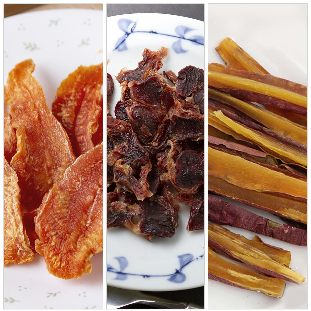 大人気のおやつが3種類セットになりました!Packun×COCOAのジャーキーシリーズ2種と、ぱっくん堂の焼き芋スティックのお得なおやつ3種セットです。